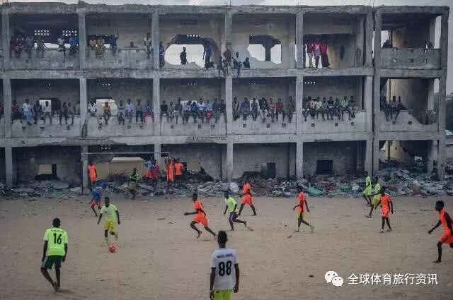 索马里摩加迪沙,被炸毁的建筑物反而成为了居民们观看足球比赛的看台