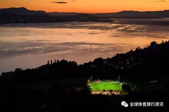 在晚霞与灯光的映衬之下,瑞士日内瓦湖边的球场显得十分静谧